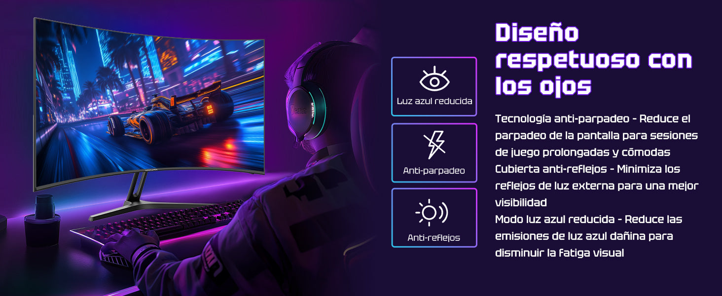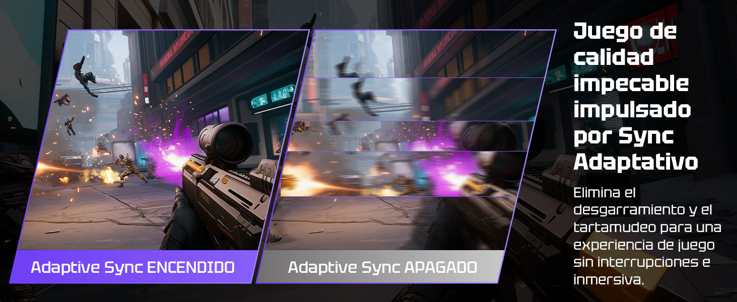 Sincronización adaptativa sin desgarros: La tecnología AMD FreeSync elimina el desgarro y el tartamudeo de la pantalla, mientras que el antiparpadeo y la luz azul de baja intensidad mantienen la vista cómoda durante sesiones de juego maratonianas.