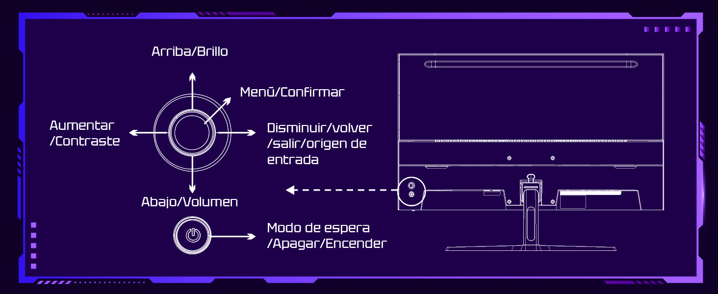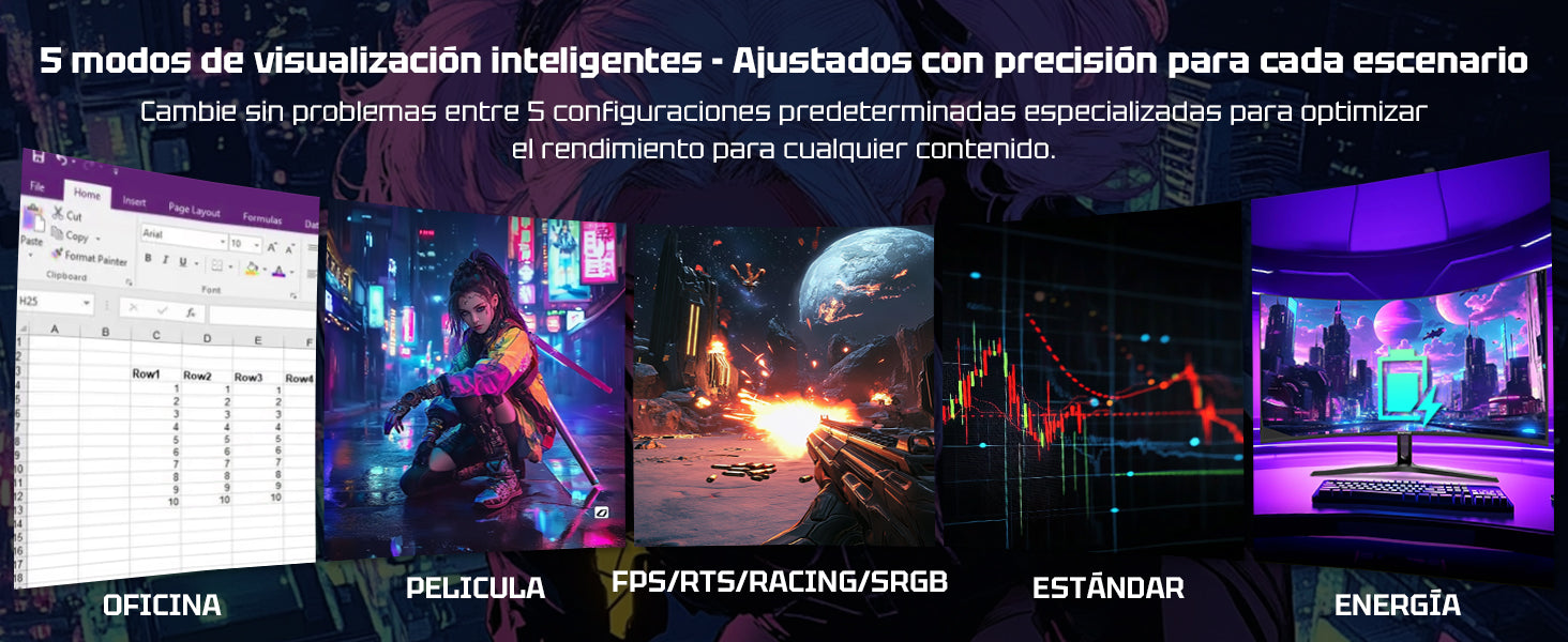 Características para juegos competitivos: Consigue una ventaja con la mira integrada, el nivel de negro ajustable para detectar enemigos en las sombras y los modos preestablecidos (FPS/RTS/Carreras) para optimizar el rendimiento al instante.