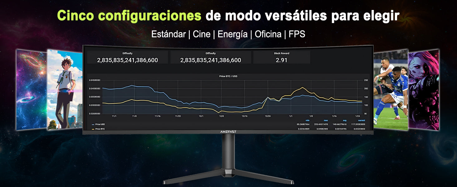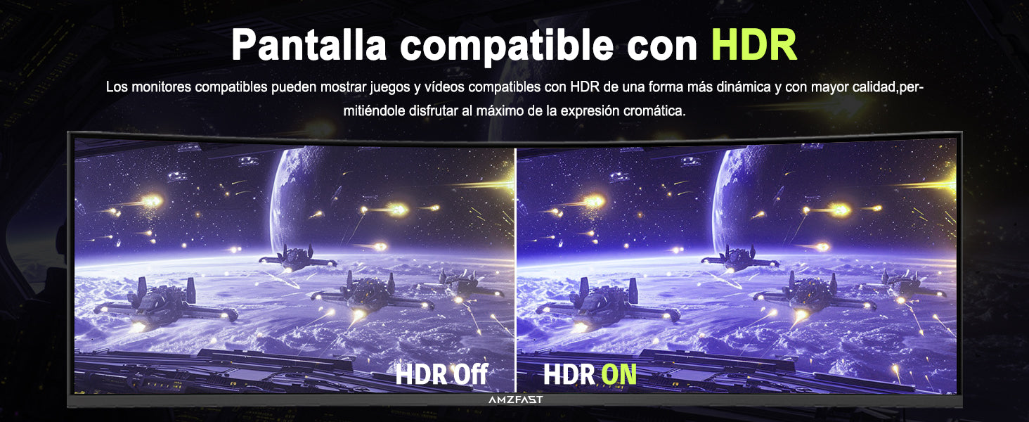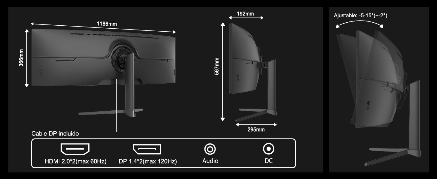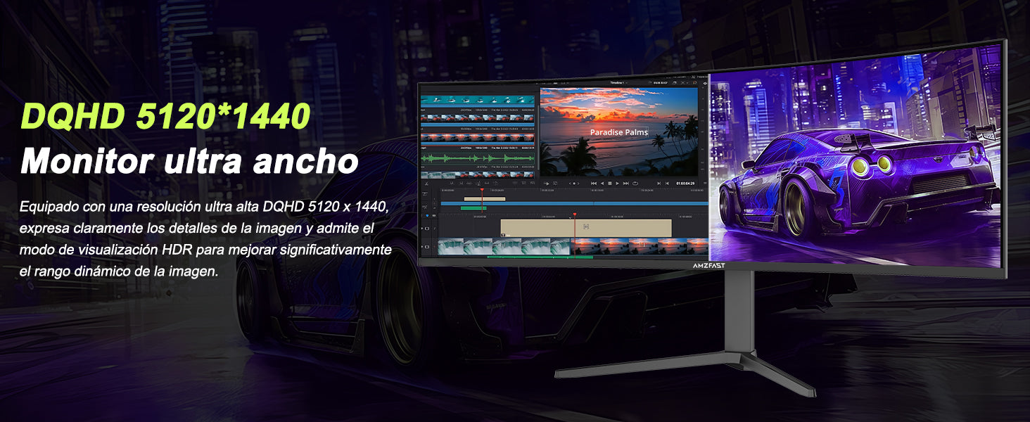 - Pantalla curva 1500R - Relación de aspecto ultraancha 32:9: La resolución ultraancha DQHD (5120 x 1440) ofrece el espacio de dos pantallas 16:9. La curvatura 1500R y la alta relación de contraste (3000:1) te sumergen en la acción, lo que la hace ideal para juegos y películas.