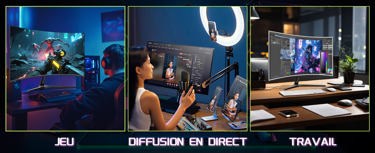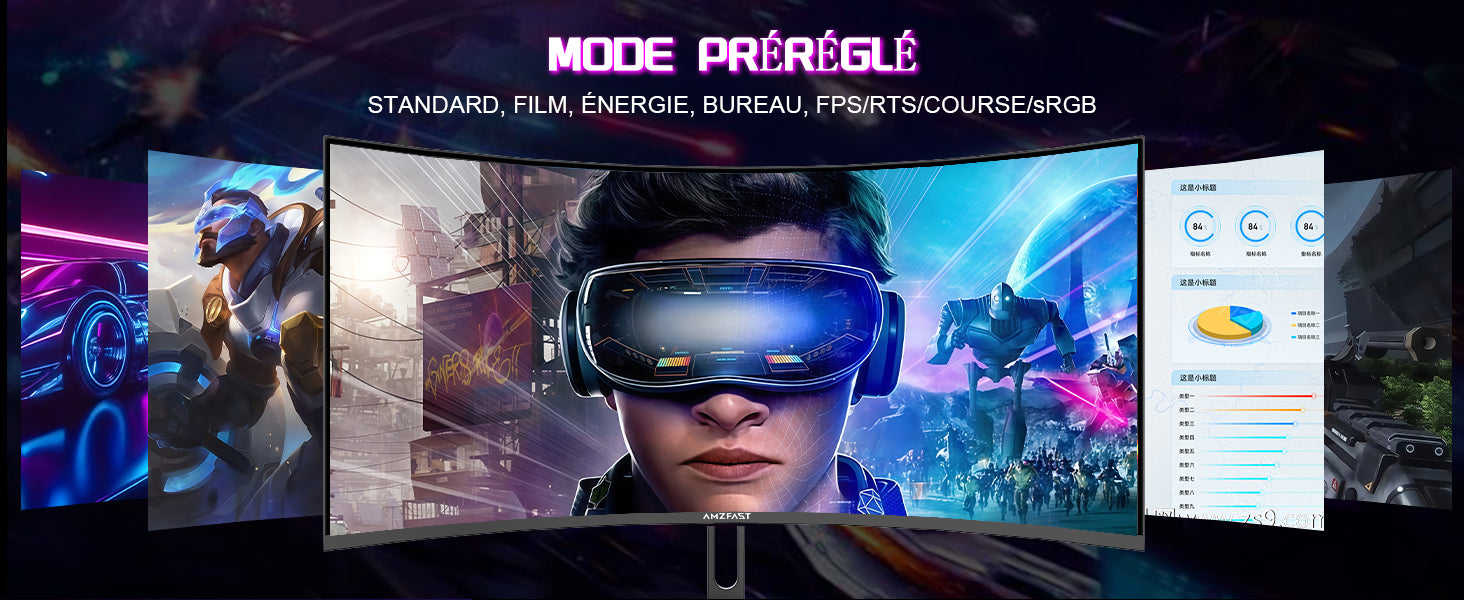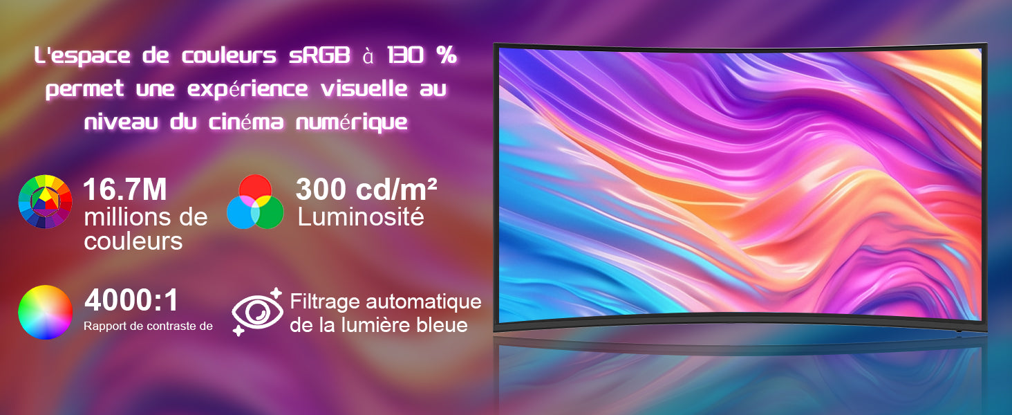 Écran incurvé 1500R + bords ultra-fins : Écran incurvé immersif 1500R aux bords étroits pour un champ de vision enveloppant, idéal pour les configurations multi-écrans et les expériences de jeu immersives.