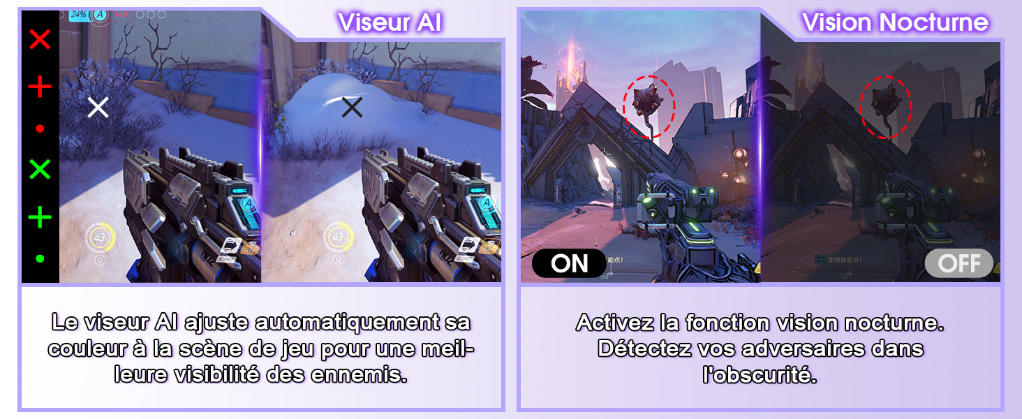 - [Caractéristiques Spéciales] Viseur Al,Vision Nocturne,Ajustement de Taille D'Écran,Adaptive-Sync.Quatre Fonctions Principales du jeu vous Aident à Mieux Découvrir et Vaincre les Ennemis