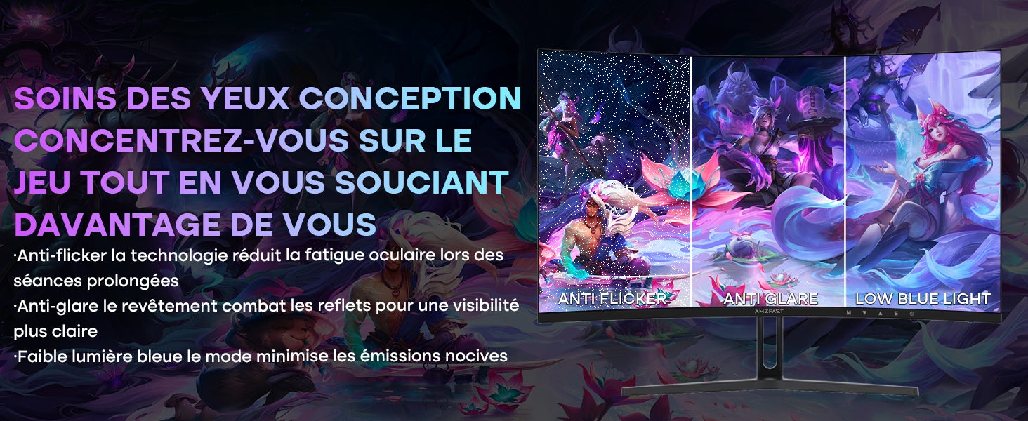 - Confort Visuel Prolongé: Équipé d'une Technologie Anti-Lumière Bleue et d'un Revêtement Anti-Reflets, ce Moniteur Réduit la Fatigue Oculaire lors des Longues Sessions de jeu ou de Travail.