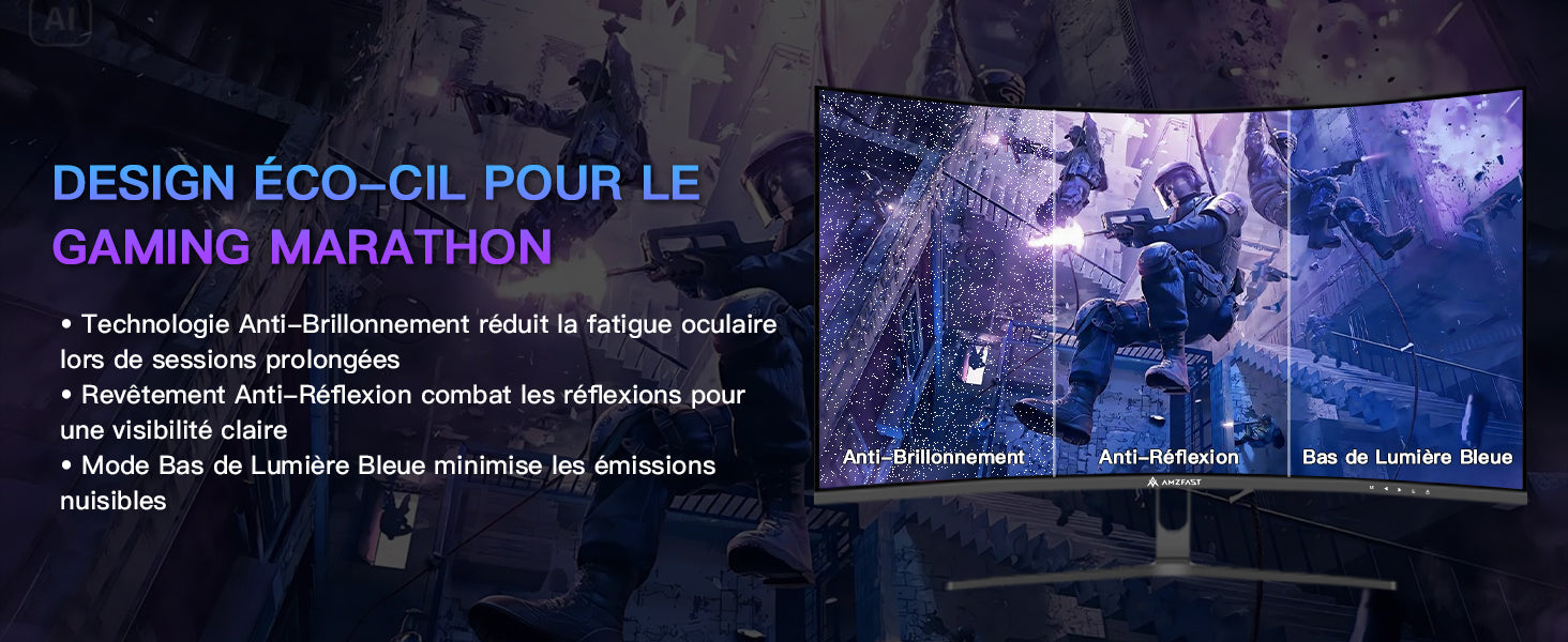 - Confort Visuel Prolongé: Équipé d'une technologie anti-lumière bleue et d'un revêtement anti-reflets, ce moniteur réduit la fatigue oculaire lors des longues sessions de jeu ou de travail.