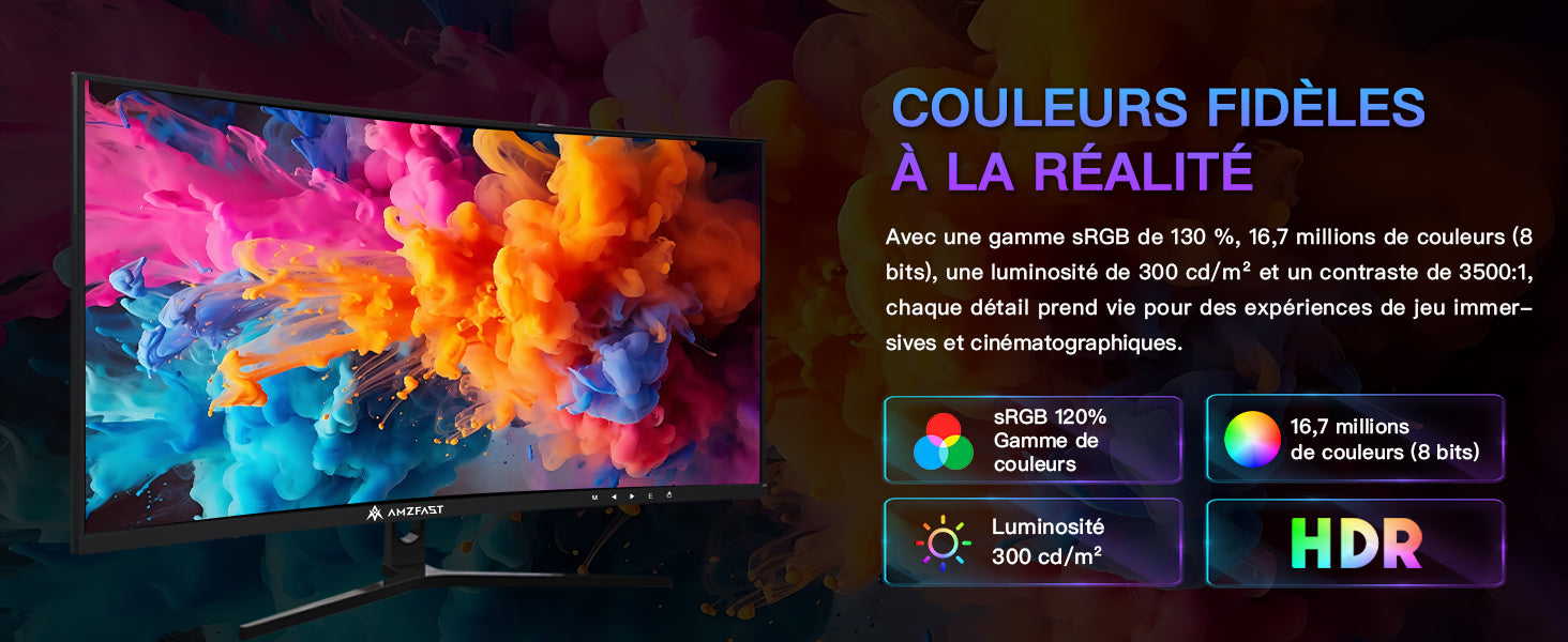 - Couleurs Précises et Vibrantes: Ce moniteur couvre 90% de l'espace colorimétrique DCI-P3 et 120% du sRGB, restituant des couleurs fidèles et des détails nets, parfaits pour les joueurs et les créateurs de contenu.