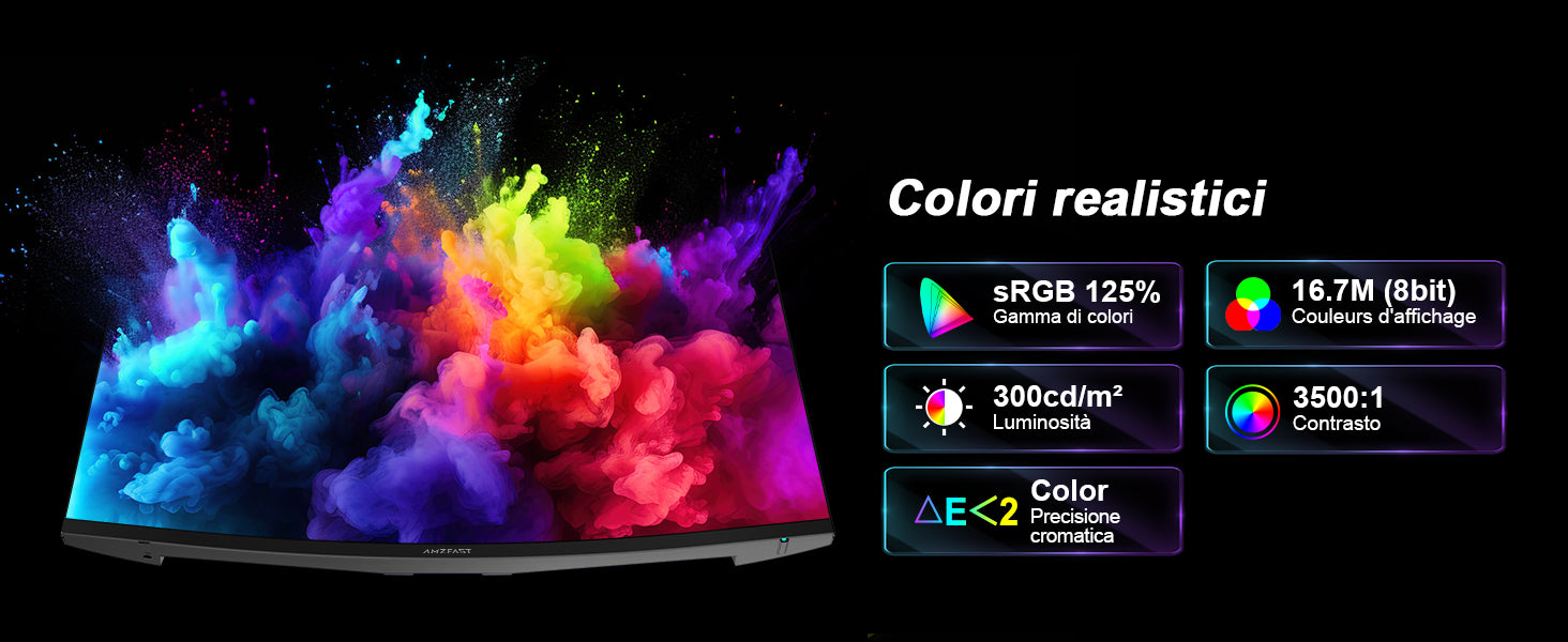 - [125% sRGB e 90% DCI-P3] combinati con una luminosità di 300 nit e un contrasto 3500:1, riproducono colori fedeli e dettagli nitidi, perfetti per giocatori e creator di contenuti.