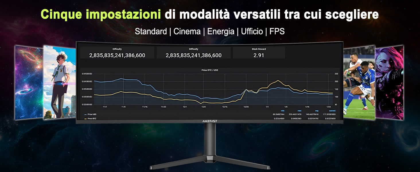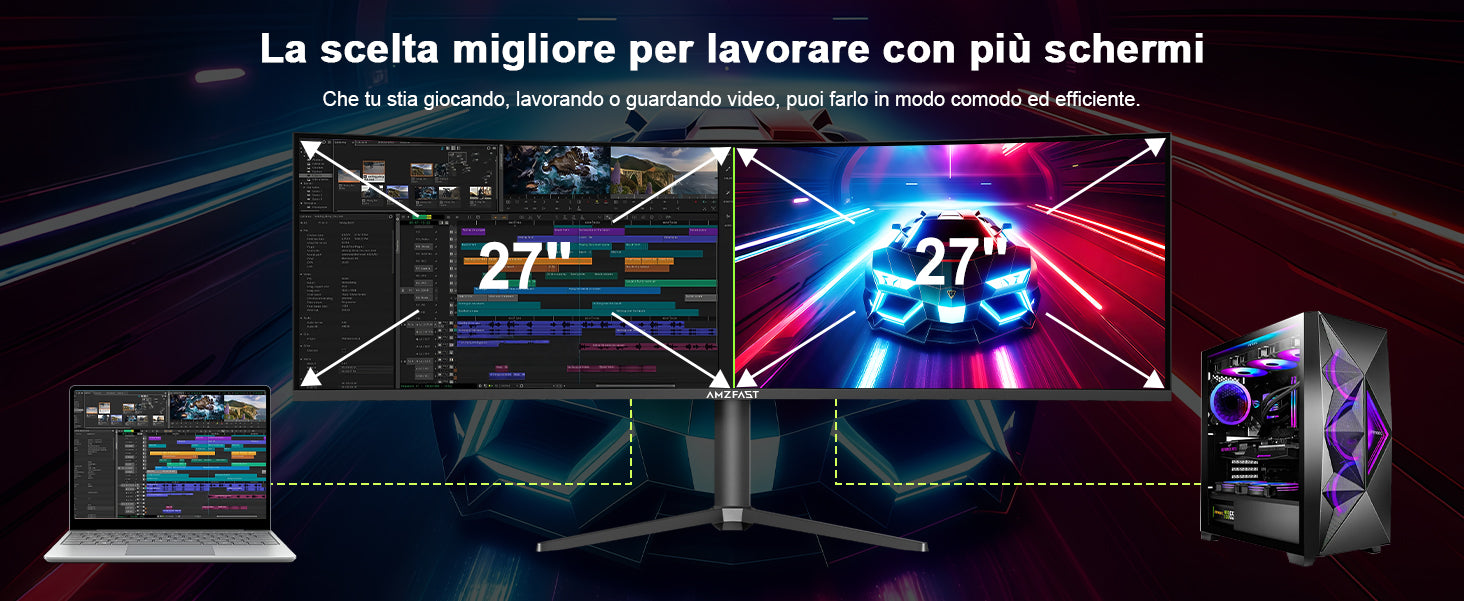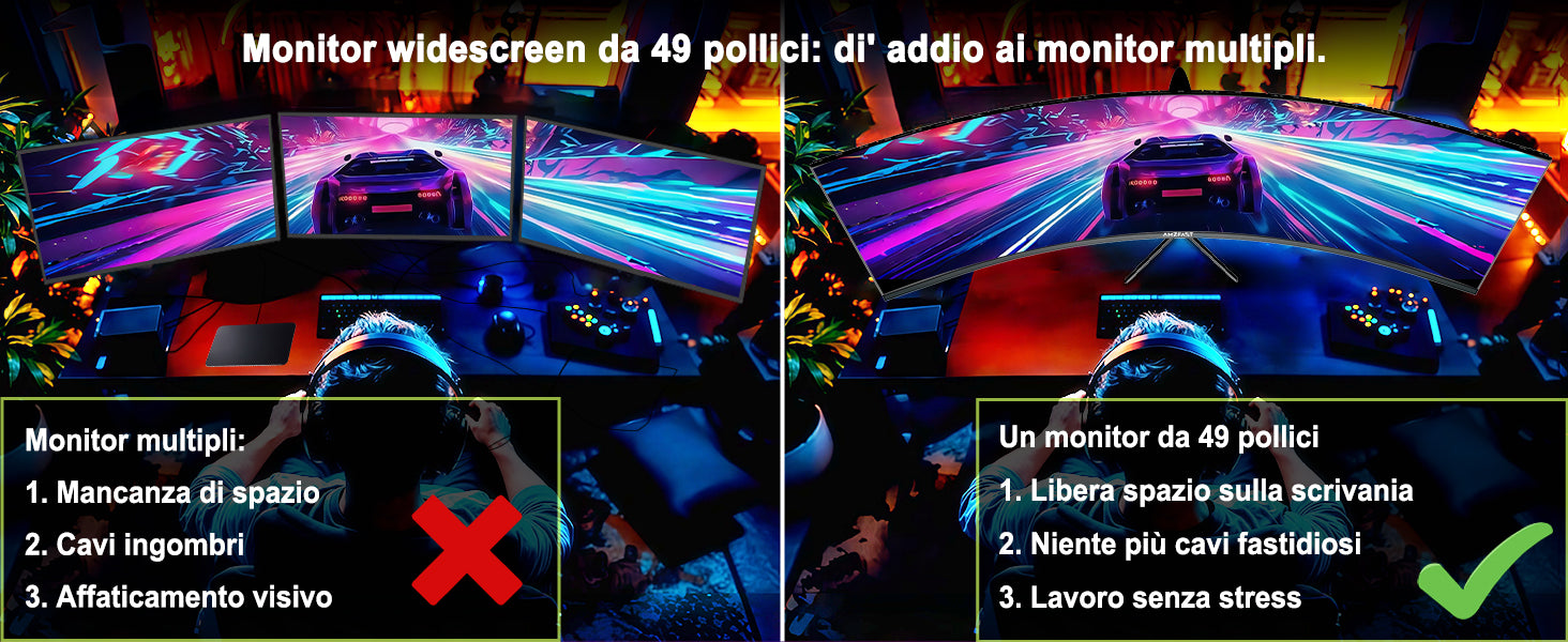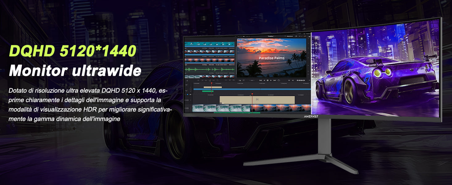 - Display curvo 1500R - Formato Ultrawide 32:9: la risoluzione Ultrawide DQHD (5120 x 1440) offre lo spazio sullo schermo di due display 16:9. La curvatura 1500R e l'elevato rapporto di contrasto (3000:1) ti immergono nell'azione, rendendolo ideale per giochi e film.