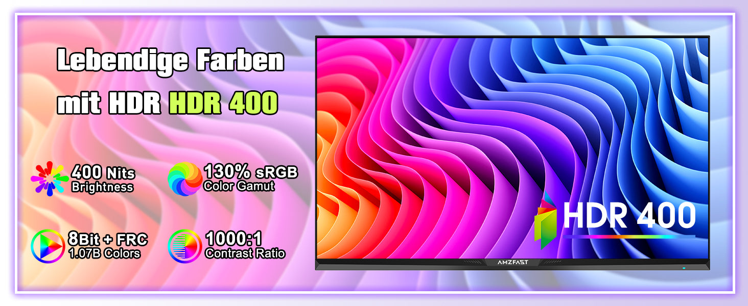 HDR400 Zertifizierte Brillanz: HDR400-Unterstützung und eine 130% sRGB-Flächenabdeckung sorgen für lebensechte Helligkeit und tiefe Kontraste.